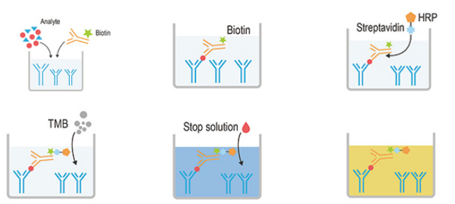 信裕生物生产的ELISA试剂盒采用抗体夹心法:将抗植物CYP83B1抗体包被于酶标板上,标本和标准品中的植物CYP83B1与抗体结合,加入生物素化的抗植物CYP83B1抗体,再加入ABC复合物与生物素抗体结合,形成免疫复合物,然后加入TMB显色底物,显色剂显蓝色,最后加终止液变黄色,游离的成分被洗去。在450 nm处测OD值,植物CYP83B1浓度与OD值之间呈正比,可通过绘制标准曲线计算出标本中CYP83B1的浓度。