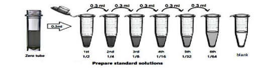 3、标准品配制:取7个1.5ml离心管,分别标注1/2,1/4,1/8,1/16,1/32,1/64,blank。从第一至七管中分别加入标准品/样品稀释液300ul。在第一管中加入标准品溶液300ul(标准品浓度),置于漩涡混合器上混匀后用加样器吸出300ul,移至第二管。如此反复作对倍稀释,从第六管中吸出300ul弃去,第七管为空白对照。(建议标准曲线使用以下浓度: 1/2,1/4,1/8,1/16,1/32,1/64,blank)。